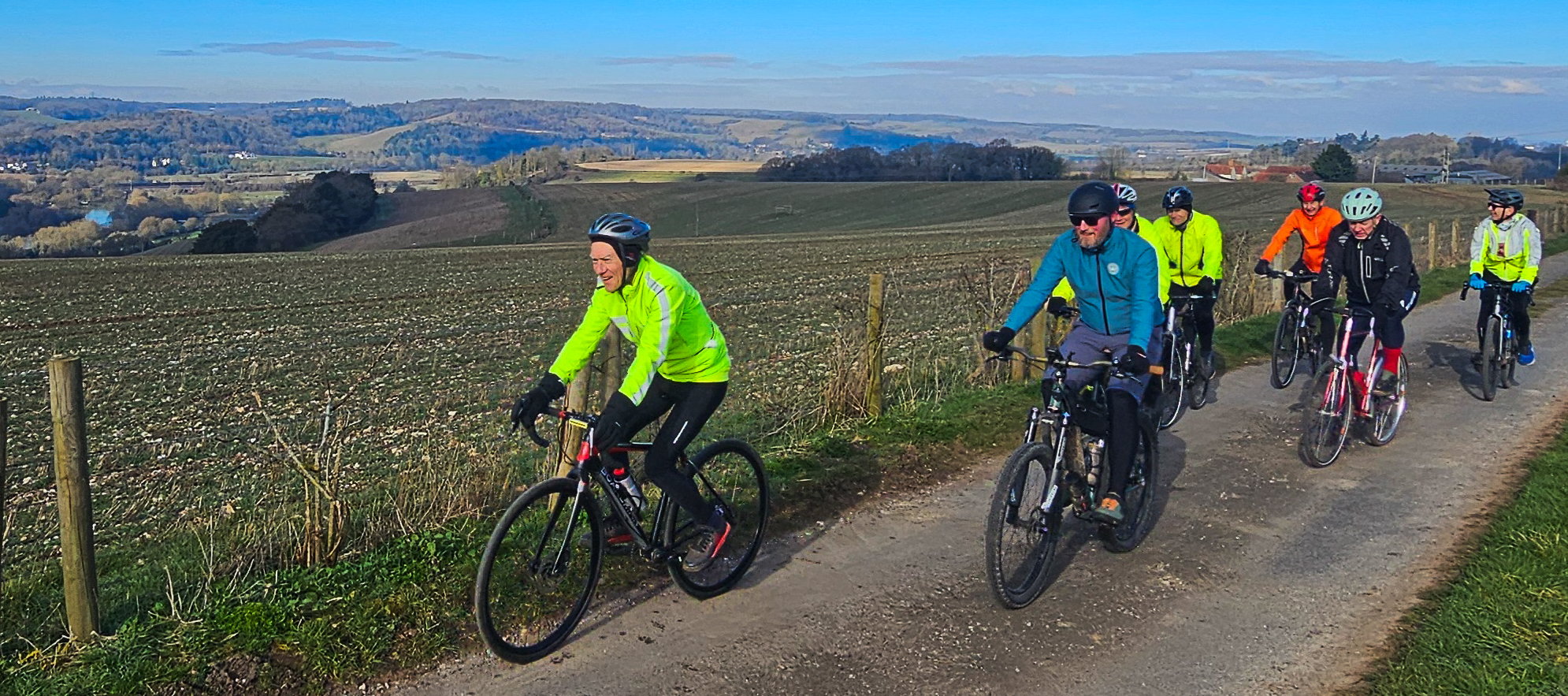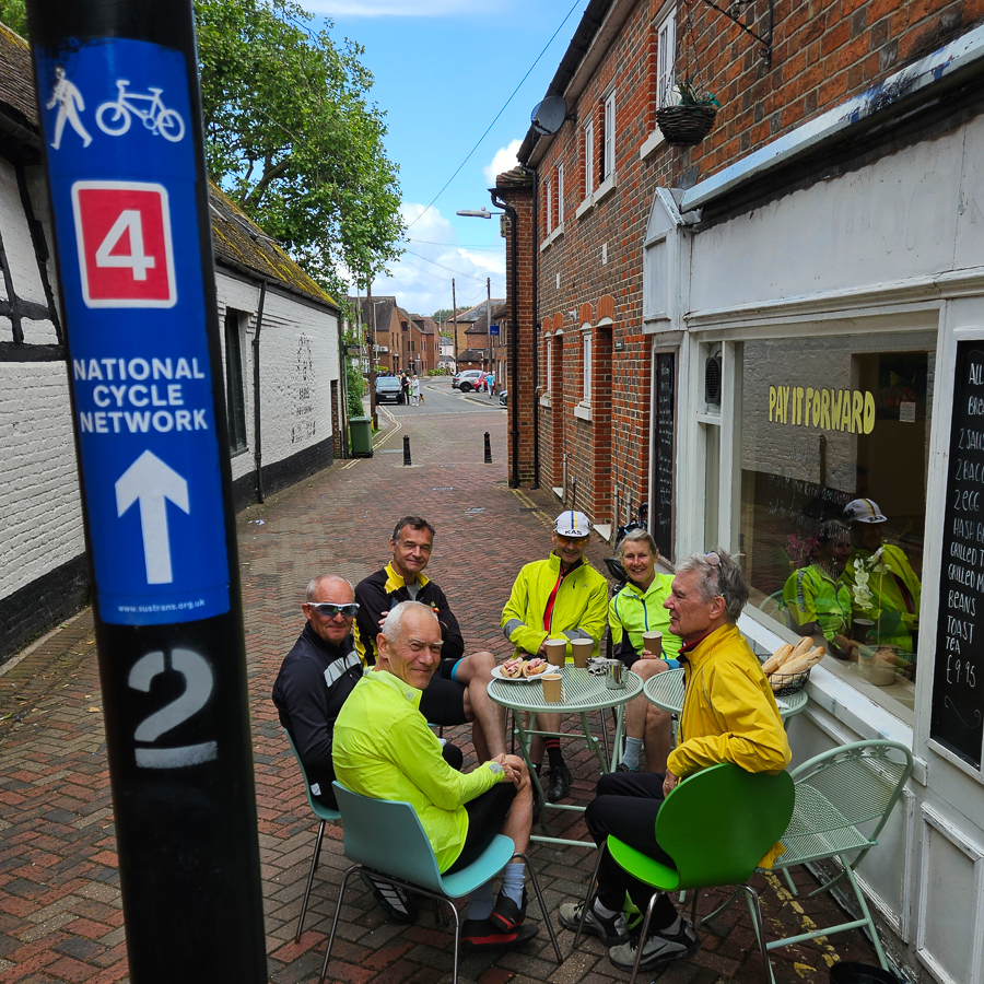 Each ride always includes a cafe stop. Longer rides sometimes even have too, as being sociable is at least as important as the physical exercise. The rides are usually on-road, but sometimes include the sort of tame off-road that can be tackled on a hybrid bike (e.g. The Ridgeway west of Streatley, or Nunhide Lane from Sulham to Theale) if it’s dry.